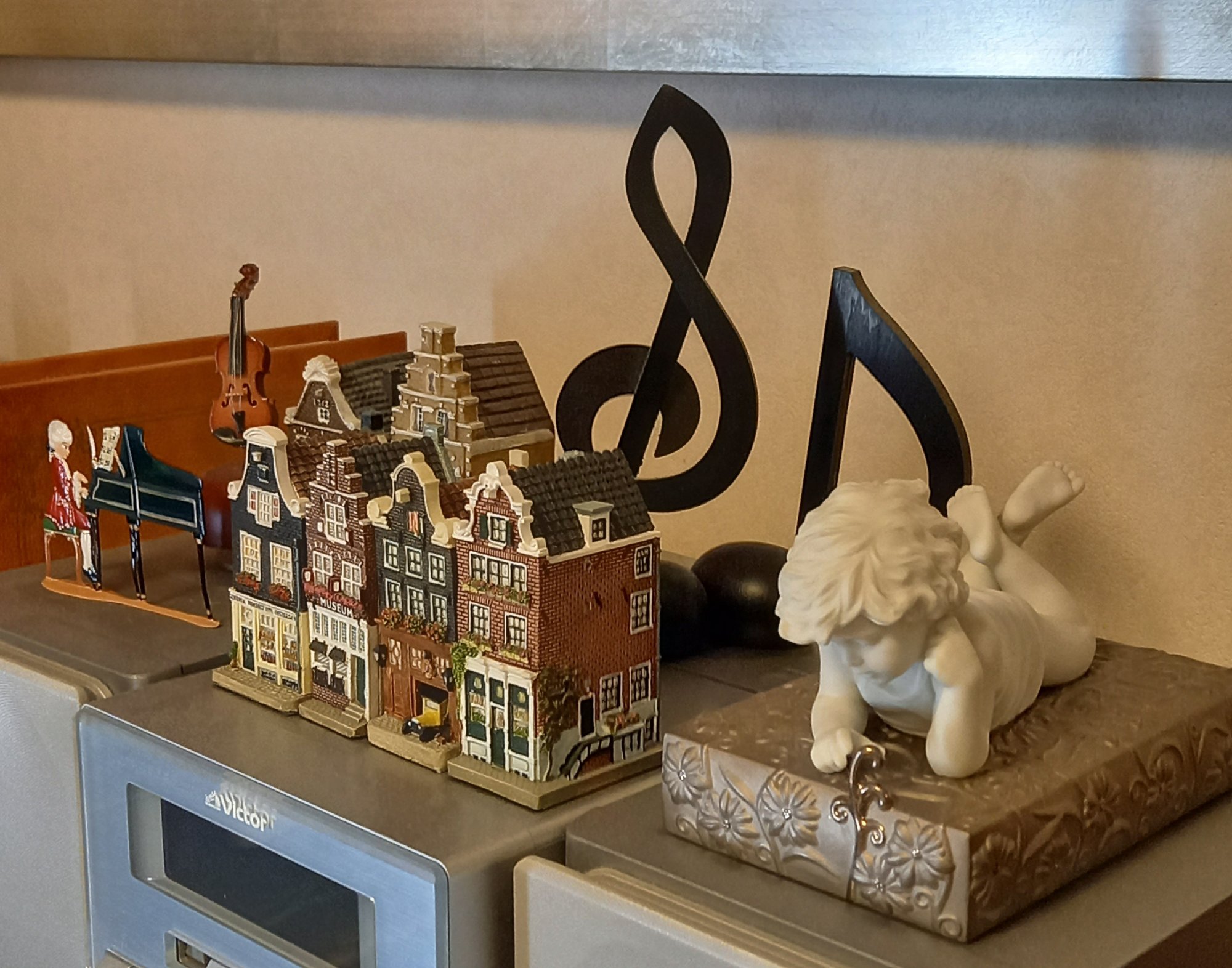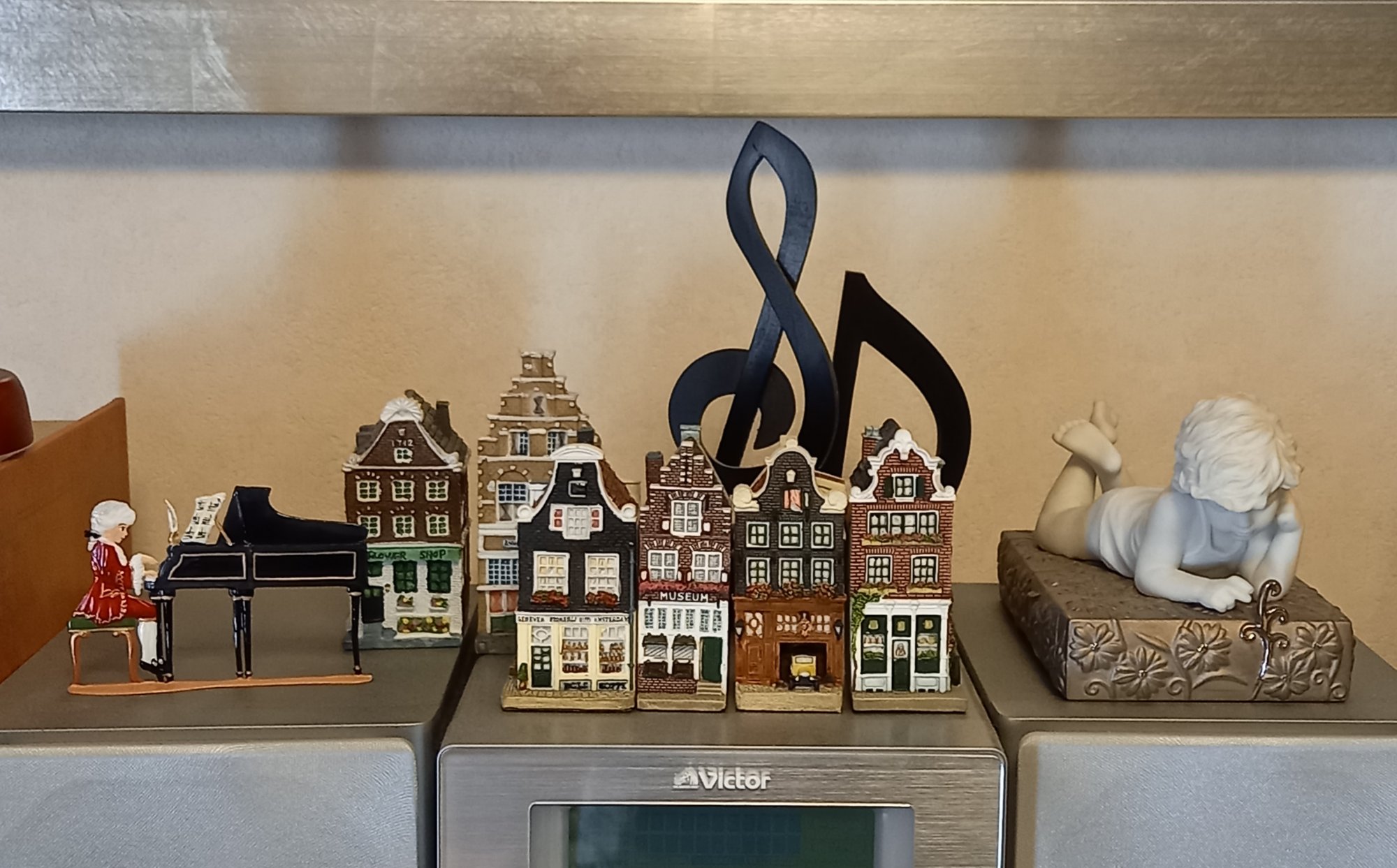 オーディオコンポの上でピアノを演奏するモーツァルト少年。